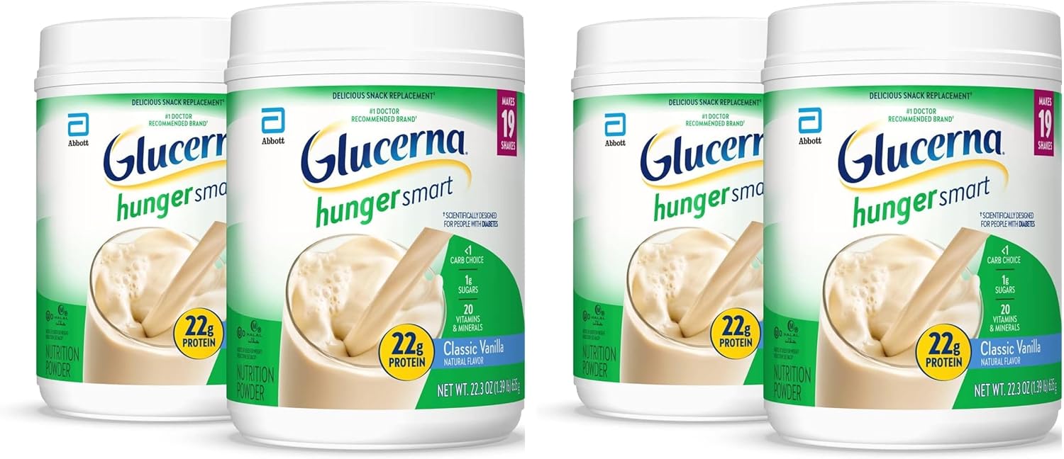 Glucerna Hunger Smart Powder is designed to replace a poor snack choice for people with diabetes and prediabetes. Glucerna Hunger Smart Powder has 22g of protein per serving to help manage hunger. Each 22.3-oz tub makes 19 8-fl-oz shakes, and each shake has 20-22 vitamins & minerals and 1g of total sugars. Available in Classic Chocolate and Classic Vanilla flavors. Gluten-free and suitable for lactose intolerance.* Glucerna is the #1 nutrition brand recommended by doctors for people with diabetes. * Not for people with galactosemia.